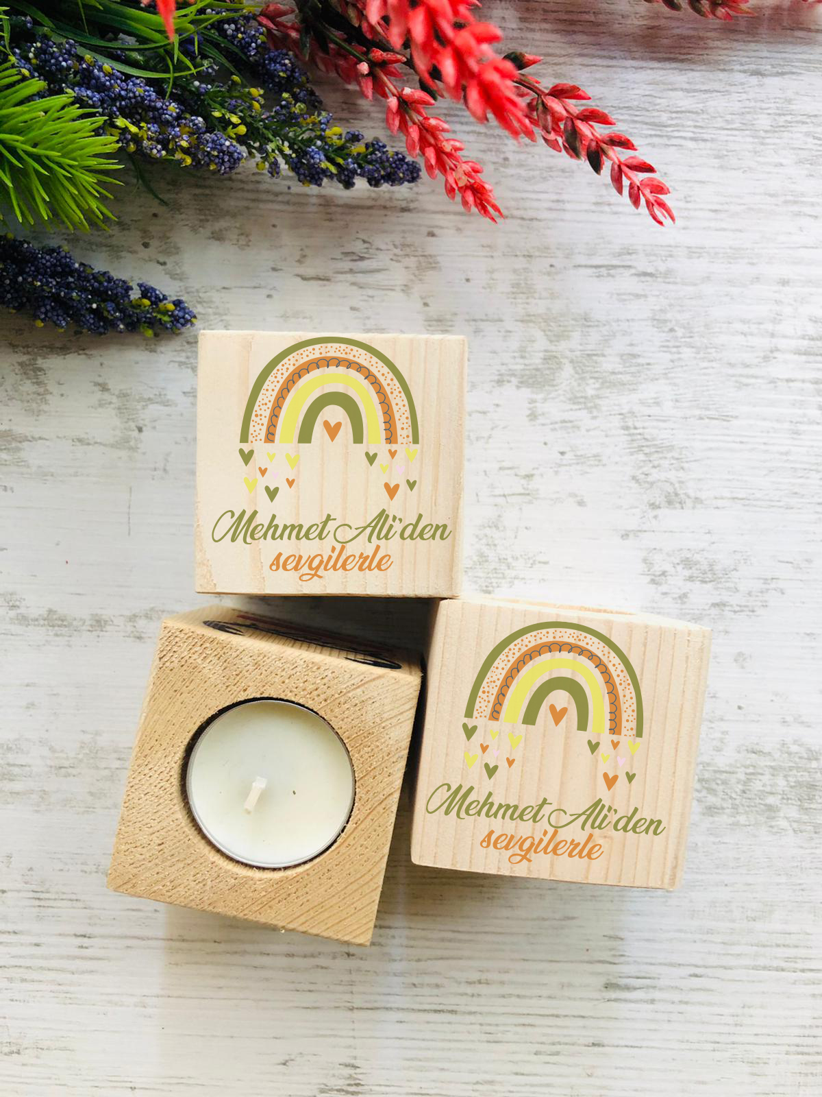 Bohem Gökkuşağı Temalı Ahşap Mumluk